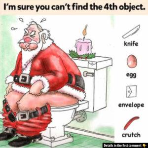 Test your observational skills with this fun visual challenge! Hidden within the playful scene are 4 cleverly concealed objects—a knife under the toilet, an egg on Santa’s…