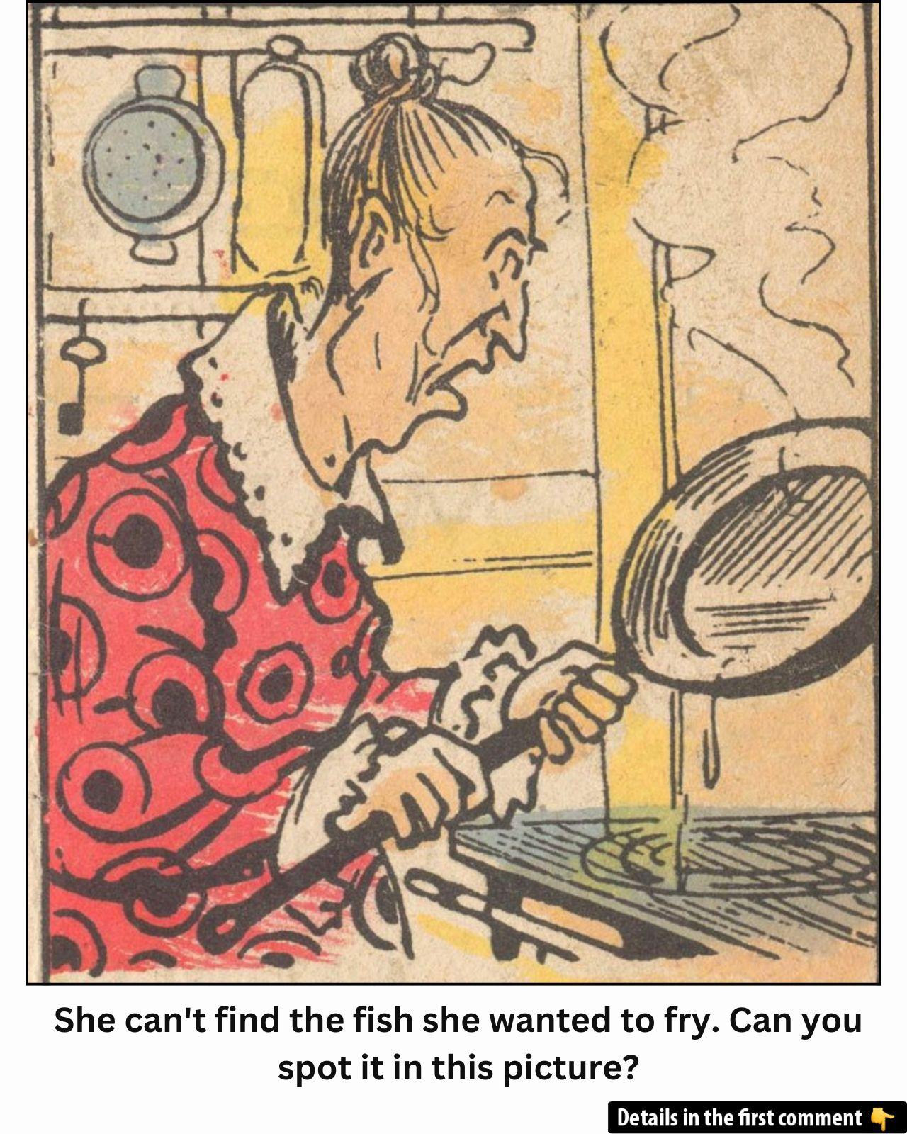Sometimes, the funniest puzzles are hidden in plain sight! In this vintage-style illustration, a woman is frantically looking for the fish she intended to cook. But the fish seems to have vanished—or has it? Look closely at the image, and see if you can spot the elusive fish. Share your thoughts in the comments: Is it obvious, or did you have to stare for a while before you saw it?